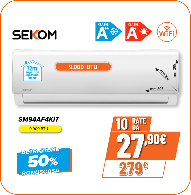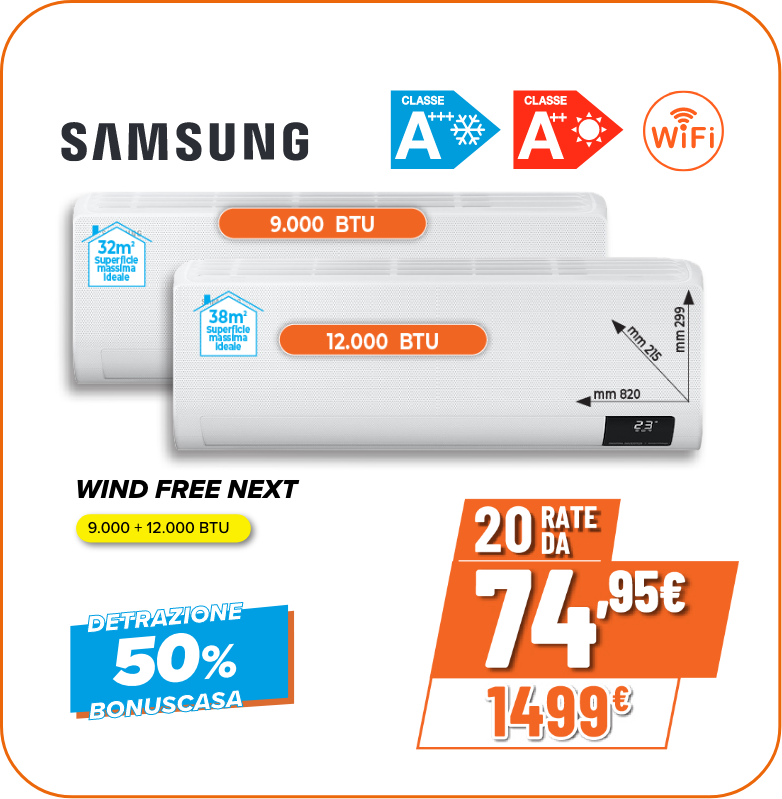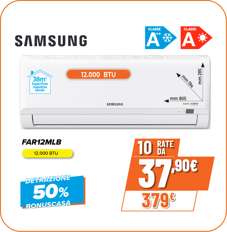Le nostre offerte comprendono una vasta gamma di condizionatori, tra cui modelli mono e multi split, fissi e portatili, inverter, a pompa di calore e ecologici, tutti classificati con ogni tipo di Classe Energetica. Tra le marche disponibili, Daikin, Haier, Samsung, Mitsubishi, Panasonic, Comfee, Argo, Olimpia Splendid e Daitsu sono solo alcune delle opzioni tra cui scegliere. Non esitare a contattarci per ottenere maggiori informazioni, dove potrai trovare numerose offerte sui climatizzatori delle marche più note e affidabili in termini di prestazioni e assistenza al cliente, comprensive di consegna e installazione.